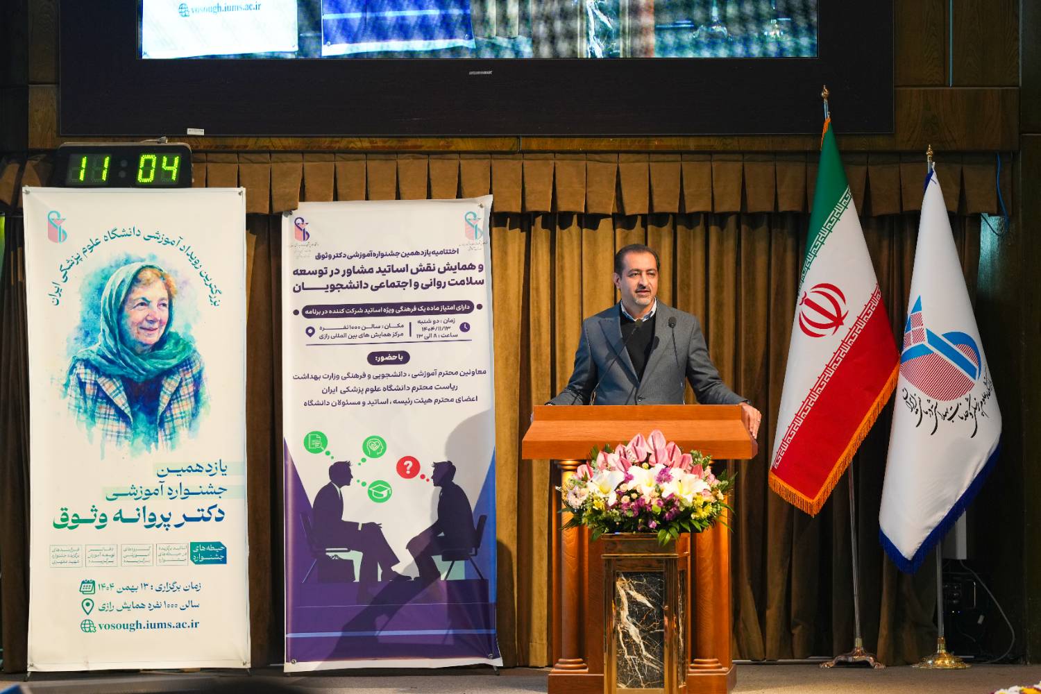 دکتر بیاضیان، معاون آموزشی دانشگاه علوم پزشکی ایران، در یازدهمین جشنواره آموزشی دکتر پروانه وثوق که امروز برگزار شد، با اشاره به پیشینه این جشنواره اظهار کرد: این جشنواره نهالی است که از سال ۱۳۹۳ توسط بزرگان دانشگاه کاشته شد و اساتید محترم آموزشی آن را به‌عنوان برترین رویداد آموزشی دانشگاه علوم پزشکی ایران پایه‌گذاری کردند. این رویداد هر سال با تغییرات و نوآوری‌هایی همراه بوده و امیدواریم روند تکامل آن ادامه یابد و ثمراتش در تحول و تعالی آموزش دانشگاه بیش از پیش نمایان شود.