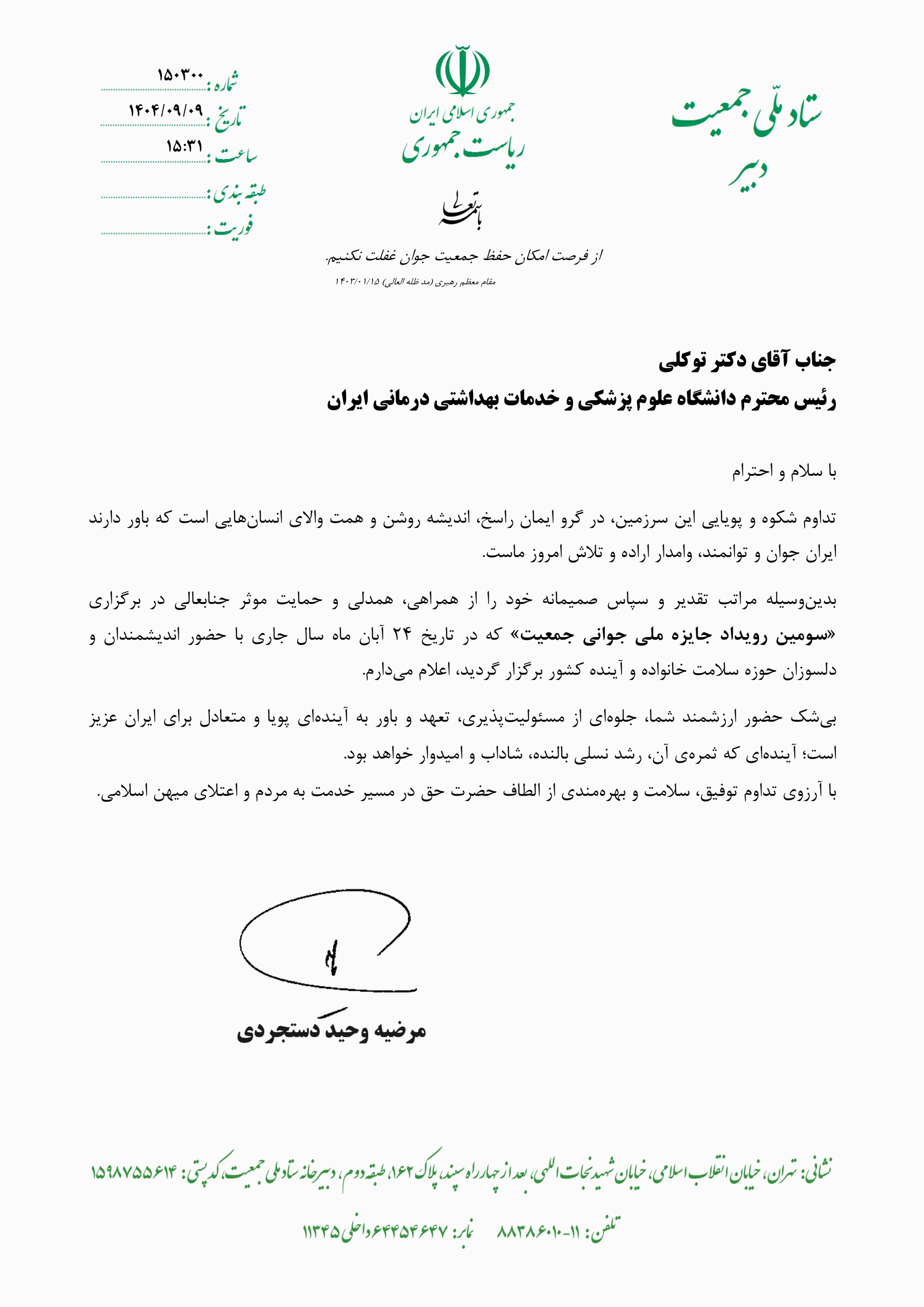 قدردانی ستاد ملی جمعیت از رئیس دانشگاه علوم پزشکی ایران بهدلیل همراهی در سومین جایزه ملی جوانی جمعیت