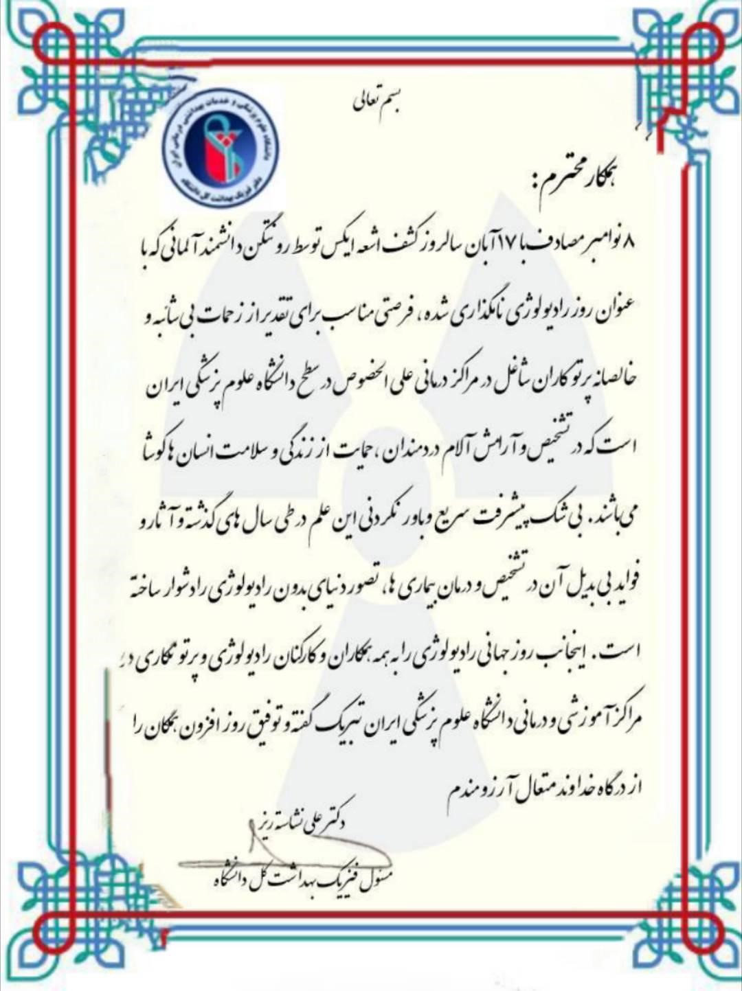 اینجانب روز جهانی رادیولوژی را به همه همکاران و کارکنان رادیولوژی و پرتونگاری در مراکز آموزشی و درمانی دانشگاه علوم پزشکی ایران تبریک گفته و توفیق روزافزون همگان را از درگاه خداوند متعال آرزومندم.