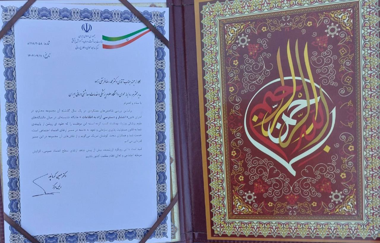به گزارش روابط‌عمومی دانشگاه علوم پزشکی ایران، اجلاس مدیران روابط‌عمومی دانشگاه‌ها و دانشکده‌های علوم پزشکی کشور از ۱۸ تا ۲۱ آذرماه در مشهد مقدس برگزار شد. در آیین افتتاحیه این رویداد، از روابط‌عمومی دانشگاه علوم پزشکی ایران به‌سبب عملکرد شایسته، دقیق و قابل تقدیر در حوزه پاسخگویی و شفاف‌سازی در سامانه دسترسی آزاد به اطلاعات تقدیر به‌عمل آمد. این بخش از برنامه به‌عنوان یکی از اصلی‌ترین محورهای اجلاس، بر ارتقای سطح استانداردهای اطلاع‌رسانی در دانشگاه‌های علوم پزشکی کشور تأکید داشت.